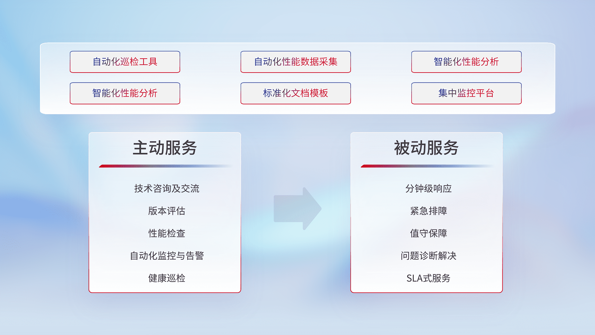 智能化工具和标准化文档,,保障服务质量,,提供主动服务(包含技术咨询、、、、版本评估、、性能检查、、自动化监控与告警、、健康巡检)和被动服务包含(分钟级响应、、、、紧急排障、、、、值守保障、、、问题诊断解决、、、、SLA服务)。。。。